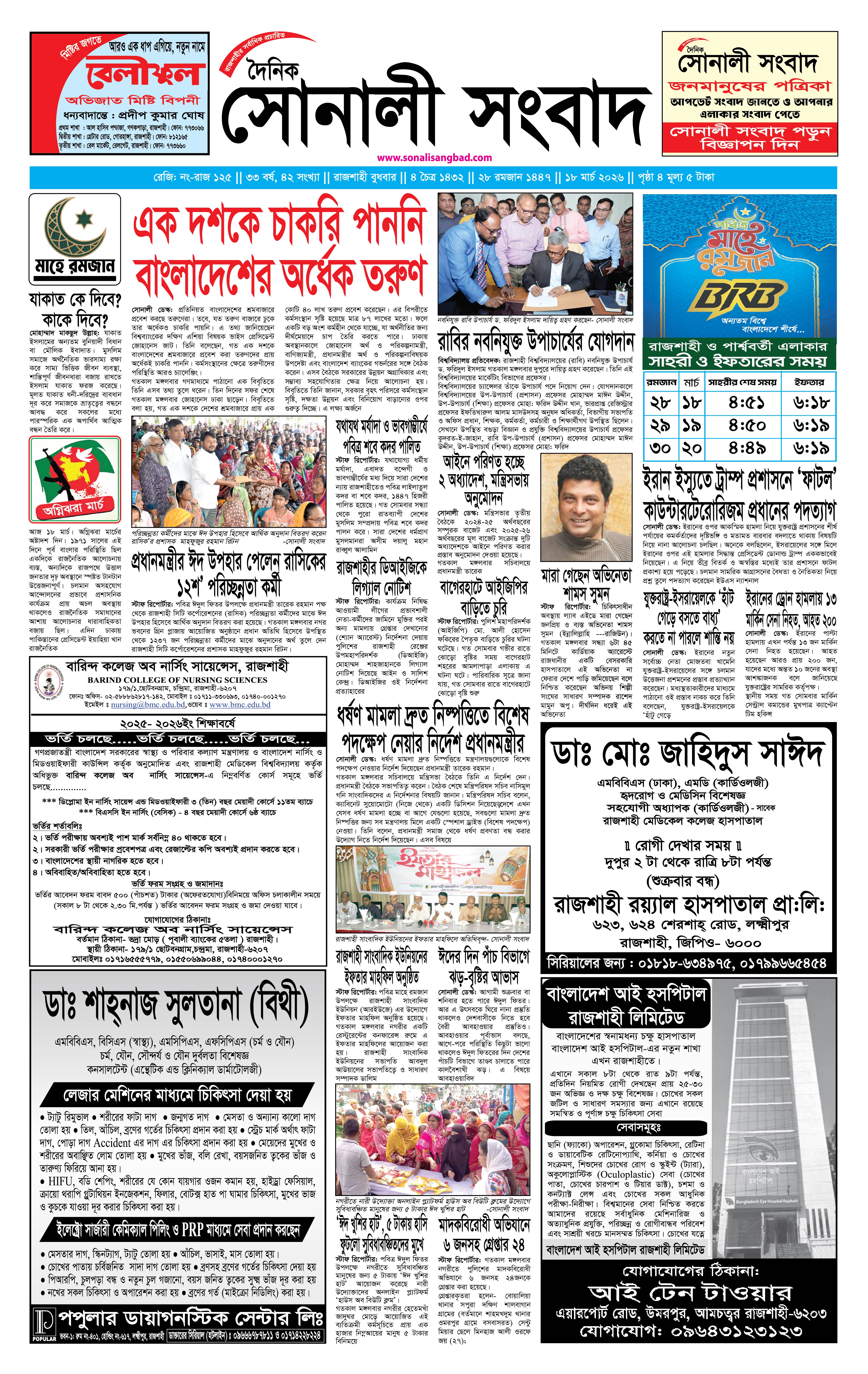 স্টাফ রিপোর্টার: গৌরবময় পথচলার ৩২ বছর অতিক্রম করলো বৃহত্তর উত্তরাঞ্চলের বহুল প্রচারিত দৈনিক সোনালী সংবাদ পত্রিকা। আজ মঙ্গলবার রাজশাহী থেকে প্রকাশিত পাঠকপ্রিয় এ পত্রিকাটি ৩৩...