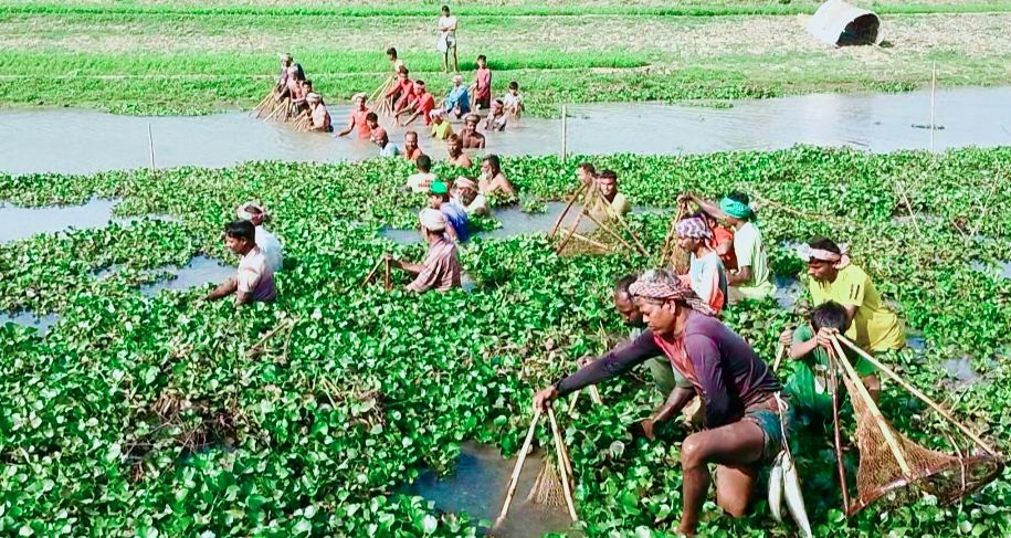 গতকাল সোমবার দুপুরে সরেজমিনে মোহনপুর-তানোরের বুরুজঘাট এলাকায় গিয়ে দেখা যায়, নানা শ্রেণি-পেশার ও বয়সের অনেক মানুষ এক সাথে নদীর দুই’ধার বরাবর এক লাইনে থেকে চাবি জাল দিয়ে নদীতে নেমে মাছ ধরছেন।