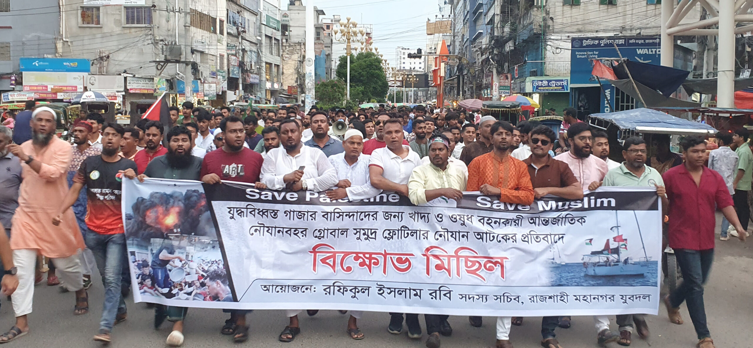 শুক্রবার বিকালে রাজশাহী মহানগর যুবদল সদস্য সচিব রফিক ইসলাম রবির আয়োজনে বিক্ষোভ মিছিলে যুবদলসহ বিএনপির অঙ্গসংগঠনের নেতা কর্মীরা অংশ নেন। মিছিলটি রাজশাহীর প্রধান প্রধান সড়ক প্রদক্ষিন করে সিটি সেন্টারের সামনে প্রতিবাদ সভা অনুষ্ঠিত হয়েছে। এসময় বক্তারা অবিলম্বে ত্রান বাহী জাহাজগুলো ছেড়ে দেবার দাবী জানান এবং ইজরাইলের বিচারের জন্য জাতিসংঘের হস্তক্ষেপ কামনা করেন।