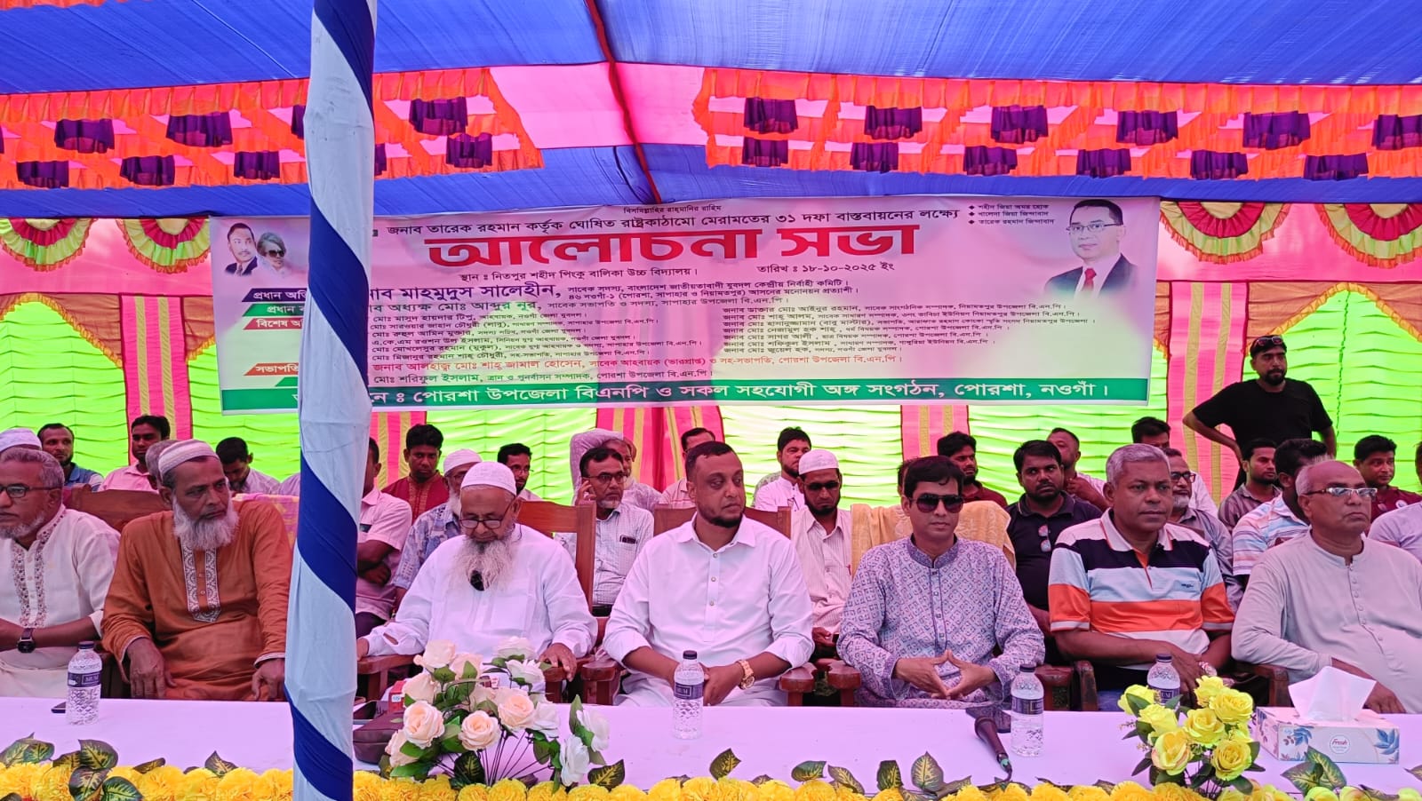 পোরশা (নওগাঁ) প্রতিনিধি: তারেক রহমান কর্তৃক ঘোষিত রাষ্ট্রকাঠামো মেরামতের ৩১ দফা বাস্তবায়নের লক্ষ্যে নওগাঁর পোরশায় আলোচনা সভা অনুষ্ঠিত হয়েছে।