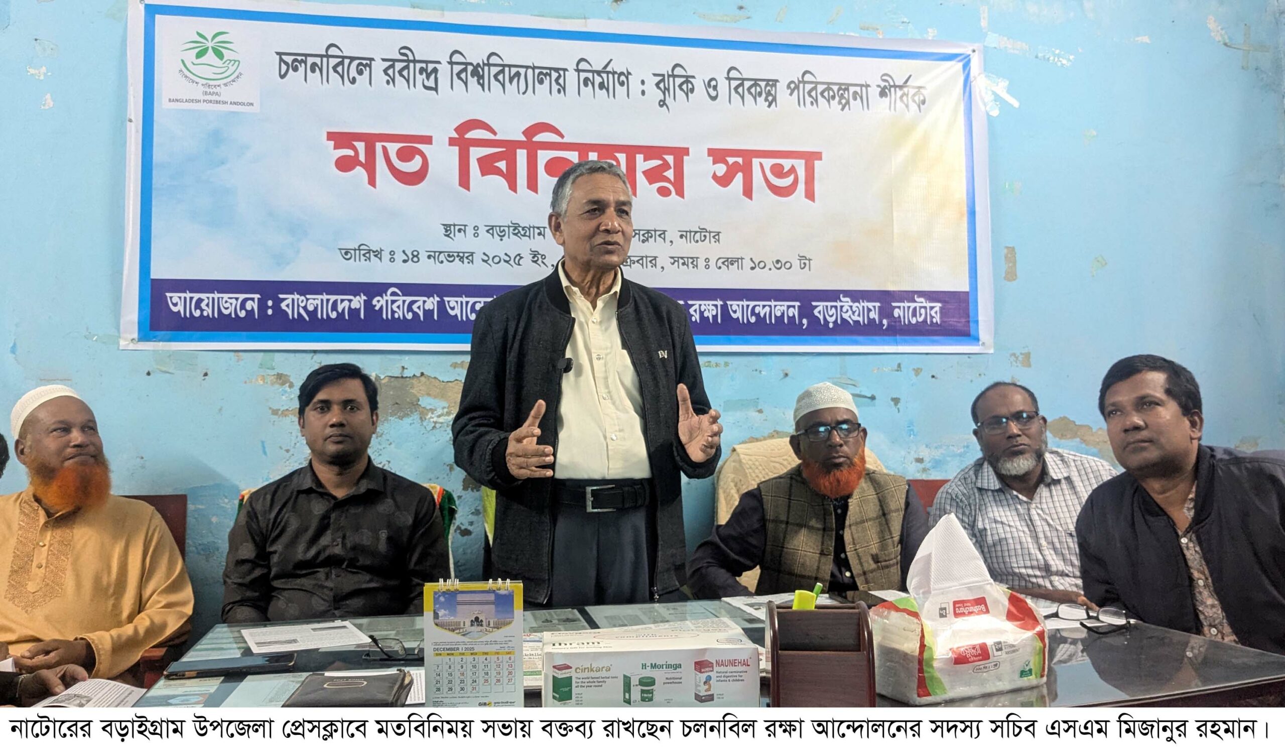 শুক্রবার বড়াইগ্রাম উপজেলা প্রেসক্লাবে ‘চলনবিলে রবীন্দ্র বিশ্ববিদ্যালয় নির্মাণ: ঝুঁকি ও বিকল্প পরিকল্পনা’ শীর্ষক মতবিনিময় সভায় এসব কথা বলেন বক্তারা।