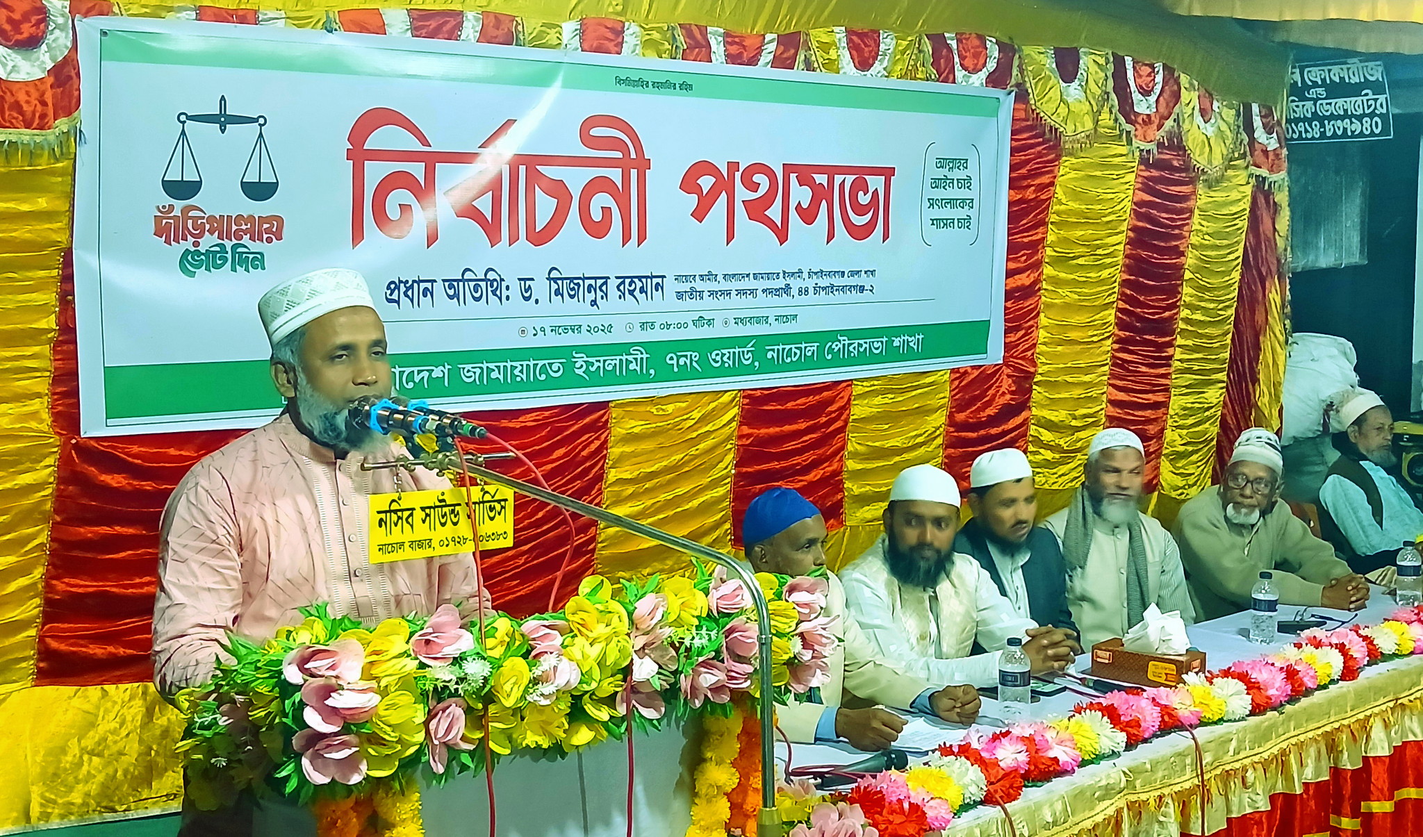 নাচোল উপজেলা ও পৌর জামায়াতের আয়োজনে গত সোমবার রাত ৮ টায় নাচোল মধ্য বাজারে পৌর ৭ নং ওয়ার্ড আমির মাওলানা তোফাজ্জল হোসেন এর সভাপতিত্বে পৌর এলাকার সকল শ্রেণি – পেশার মানুষের অংশগ্রহণে নির্বাচনি পথসভায় প্রধান অতিথির বক্তব্য দেন, ড.মিজানুর রহমান।