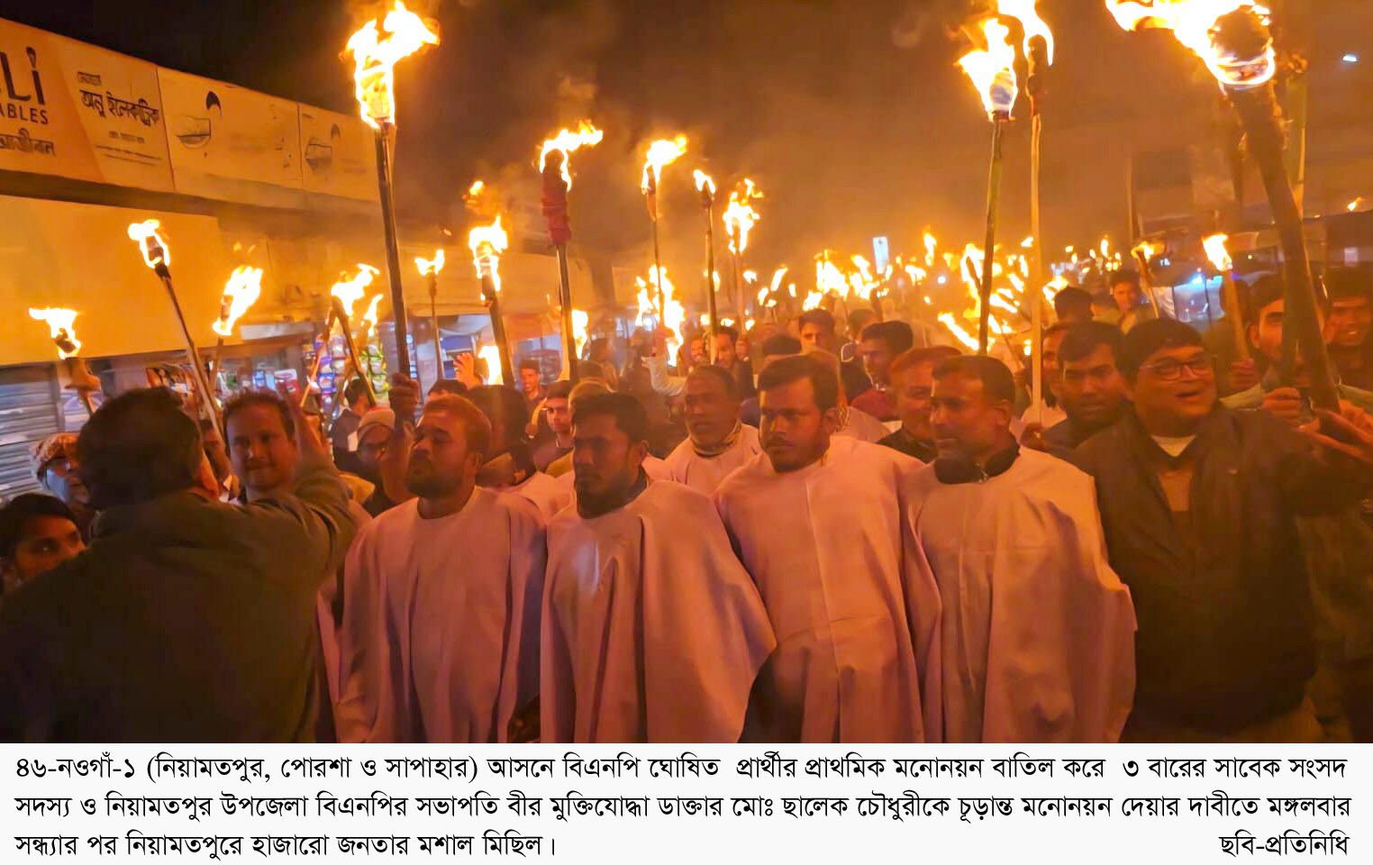 নিয়ামতপুরে বিএনপির প্রার্থী পরিবর্তনের দাবিতে মশাল মিছিল