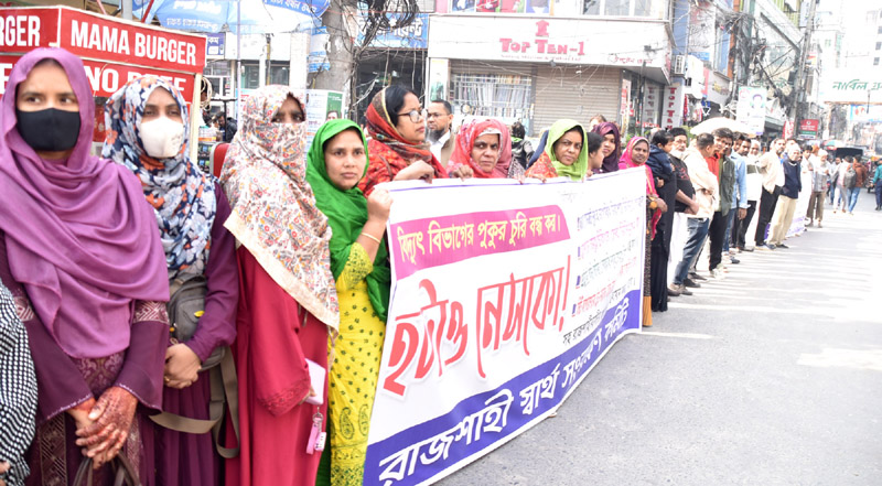 শনিবার বেলা সাড়ে ১১টায় নগরের সাহেববাজার জিরোপয়েন্টে রাজশাহী স্বার্থ সংরক্ষণ কমিটির আয়োজনে অনুষ্ঠিত এই মানববন্ধনে বিভিন্ন সামাজিক ও নাগরিক সংগঠনের নেতারা অংশ নেন।