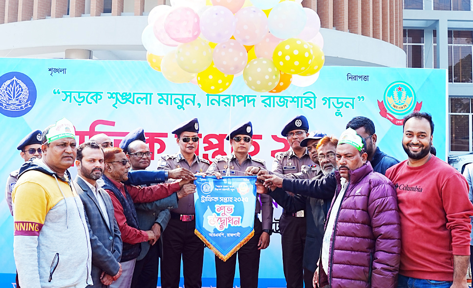 সড়কে শৃঙ্খলা জোরদার ও জনসচেতনতা বৃদ্ধির লক্ষ্যে গতকাল রোববার সকালে রাজশাহী মেট্রোপলিটন পুলিশ সদর দপ্তরের সামনে বেলুন-ফেস্টুন উড়িয়ে ট্রাফিক সপ্তাহের আনুষ্ঠানিক উদ্বোধন করেন রাজশাহী মেট্রোপলিটন পুলিশ কমিশনার ড. মো. জিল্লুর রহমান।