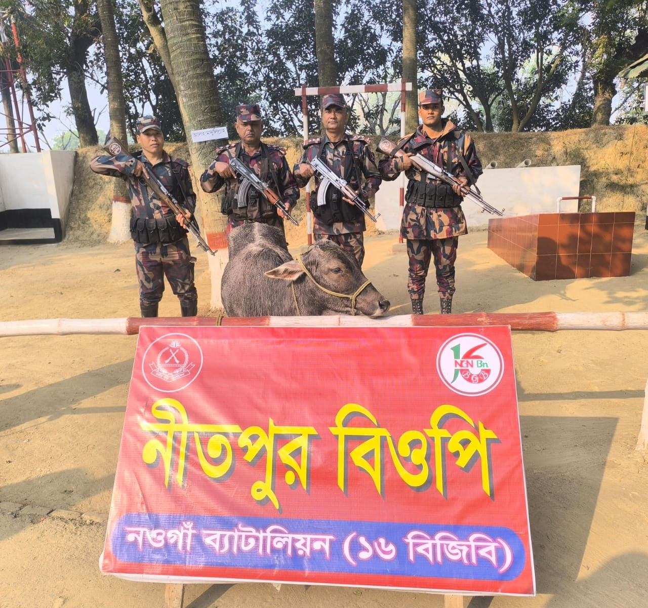 গতকাল মঙ্গলবার সকাল ৯টায় নওগাঁ ব্যাটালিয়ন (১৬ বিজিবি) নিতপুর বিওপির টহল সদস্যরা উপজেলার নিতপুর বিওপির সীমান্ত মেইন পিলার ২৩০ এর ৫৮ আর থেকে আনুমানিক ৫০০ গজ বাংলাদেশের অভ্যন্তরে টেকঠা এলাকার সাধুর ডিপ এর পার্শ্বে থেকে মালিকবিহীন ভারতীয় গরুটি আটক করেন।