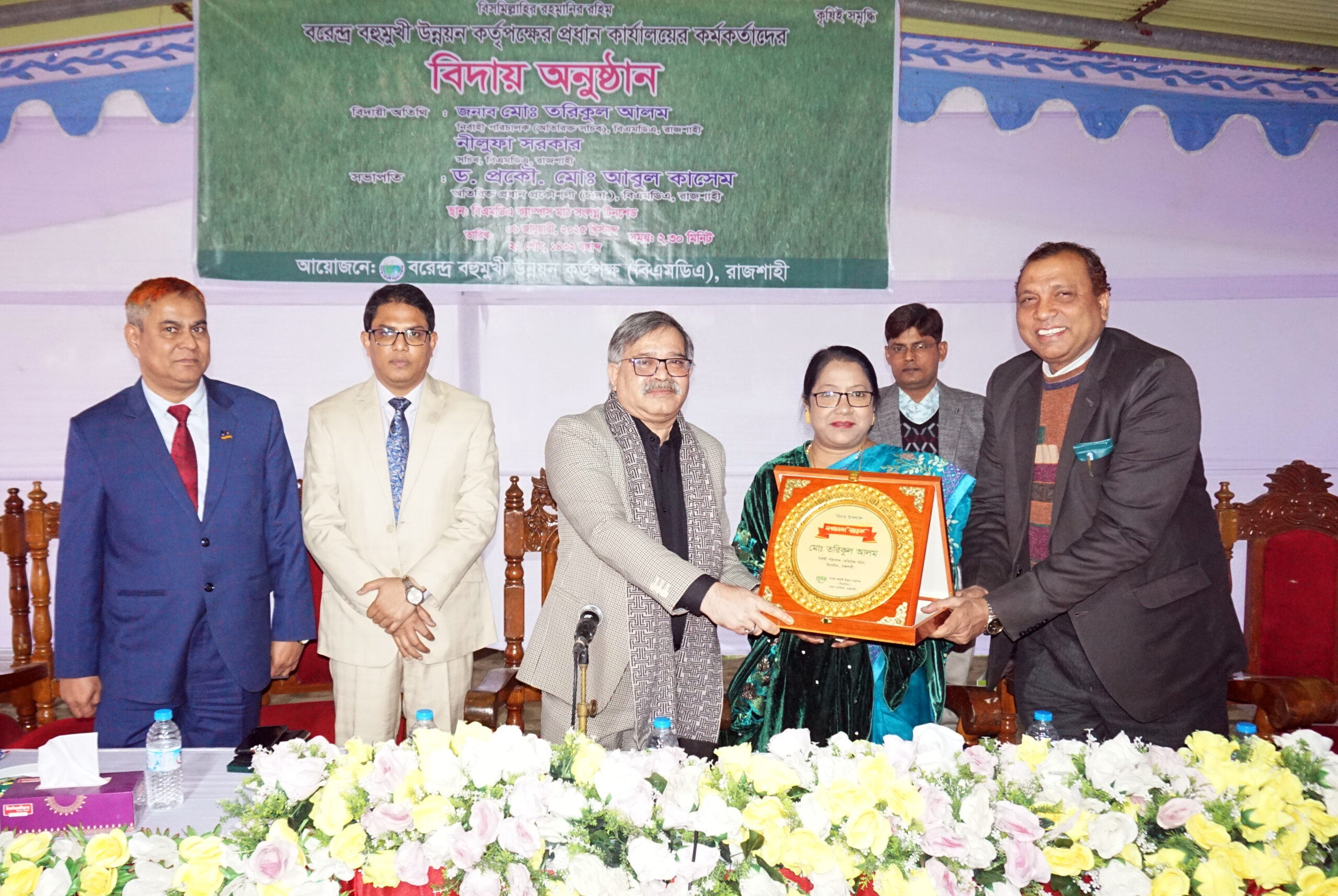 মঙ্গলবার প্রধান কার্যালয়ে বিএমডিএর আয়োজনে বিদায় সংবর্ধনা অনুষ্ঠিত হয়। বরেন্দ্র বহুমুখী উন্নয়ন কর্তৃপক্ষের অতিঃ প্রধান প্রকৌশলী ড. আবুল কাসেম এর সভাপতিত্বে উপস্থিত ছিলেন বরেন্দ্র বহুমুখী উন্নয়ন কর্তৃপক্ষের বিদায়ী নির্বাহী পরিচালক তরিকুল আলম ও তার সহধর্মিণী সহকারী অধ্যাপক লালমাটিয়া কলেজ সেলিনা আখতার।