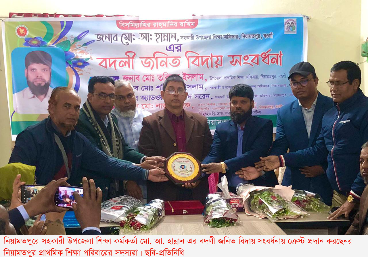 নিয়ামতপুরে প্রিয় শিক্ষা কর্মকর্তাকে বিদায় সংবর্ধনা প্রাথমিক শিক্ষকদের