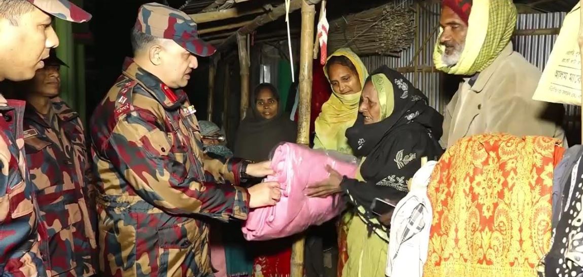 চাঁপাইনবাবগঞ্জে গভীর রাতে বাড়ি বাড়ি গিয়ে বিজিবির শীতবস্ত্র বিতরণ