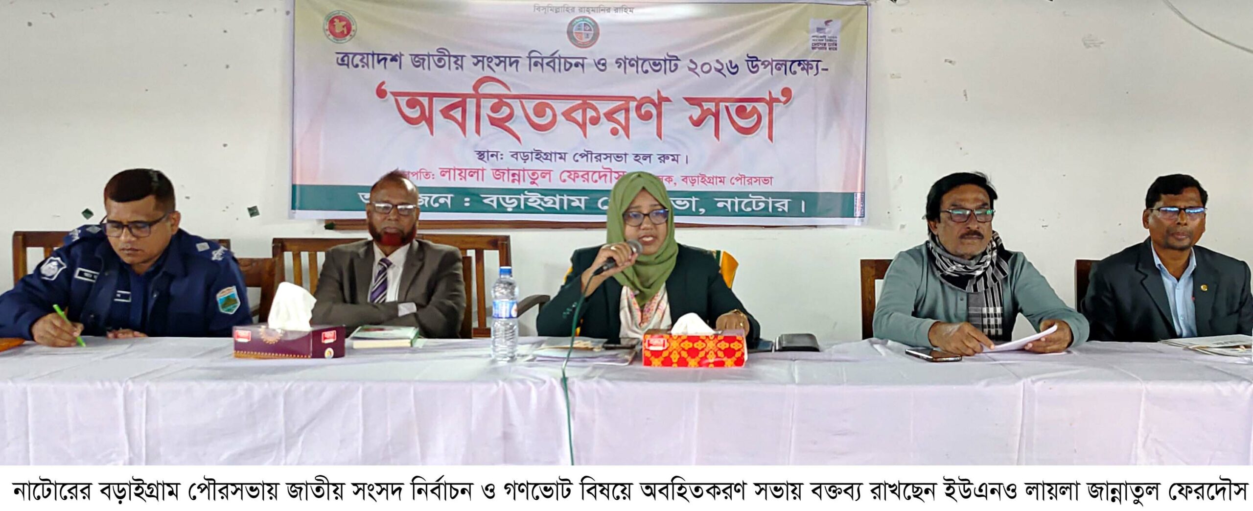 বড়াইগ্রাম (নাটোর) প্রতিনিধি: নাটোরের বড়াইগ্রাম পৌরসভার আয়োজনে ত্রয়োদশ জাতীয় সংসদ নির্বাচন ও গণভোট ২০২৬ উপলক্ষে অবহিতকরণ সভা অনুষ্ঠিত হয়েছে। গতকাল মঙ্গলবার দুপুরে বড়াইগ্রাম পৌর মিলনায়তনে এই সভা অনুষ্ঠিত হয়।