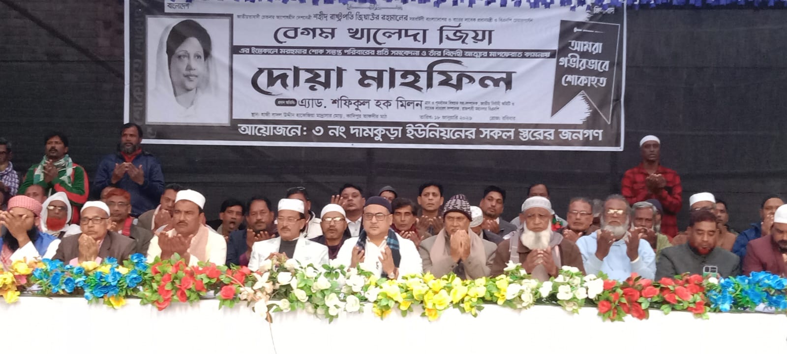 গতকাল রোববার খালেদা জিয়ার আত্মার মাগফিরাত কামনায় দামকুড়া ইউনিয়নের সকল স্তরের জনগণের আয়োজনে হাজী বাদল উদ্দীন হাফেজিয়া মাদ্রাসার মোড়, কাদিপুর তাফসির মাঠে দোয়া মাহফিলে প্রধান অতিথির বক্তব্যে রাজশাহী-৩ আসনে বিএনপি মনোনীত ধানের শীষের প্রার্থী এডভোকেট শফিকুল হক মিলন এসব কথা উল্লেখ করেন।