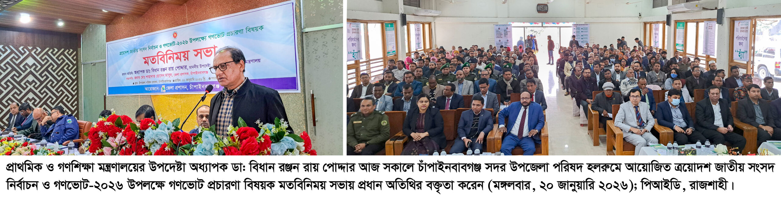 গতকাল মঙ্গলবার দুপুরে চাঁপাইনবাবগঞ্জ সদর উপজেলা পরিষদ মিলনায়তনে জেলা প্রশাসনের আয়োজনে ত্রয়োদশ জাতীয় সংসদ নির্বাচন ও গণভোট প্রচারণা উপলক্ষে আয়োজিত মতবিনিময় সভায় প্রধান অতিথির বক্তব্যে এসব কথা বলেন তিনি। ডা. বিধান রঞ্জন রায় পোদ্ধার বলেন, বর্তমান সরকার কোনো রাজনৈতিক দলের স্বার্থ রক্ষা করছে না। এই সরকার গঠিত হয়েছে গণঅভ্যুত্থানের মধ্য দিয়ে, তাই জনগণের সেই আন্দোলনের আকাঙ্খা বাস্তবায়ন করাই সরকারের দায়িত্ব। মানুষের প্রত্যাশা যেন বাস্তবায়িত হয়, সে কারণেই গণভোটে ‘হ্যাঁ’ ভোট দেওয়ার আহ্বান জানানো হচ্ছে। তিনি আরও বলেন,‘এ অবস্থানকে রাজনৈতিক পক্ষপাত বলা যাবে না। বরং এটি জনগণের আন্দোলন ও পরিবর্তনের পক্ষে সরকারের স্পষ্ট অবস্থান।’