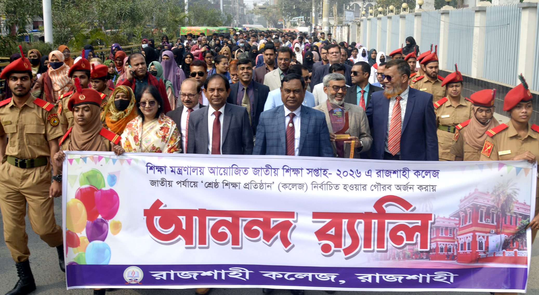 আনন্দ শোভাযাত্রাটি রাজশাহী কলেজ প্রাঙ্গণ থেকে যাত্রা শুরু করে জাদুঘর মোড় হয়ে আবার কলেজে ফিরে আসে। উক্ত শোভাযাত্রার নেতৃত্বে ছিলেন রাজশাহী কলেজের অধ্যক্ষ প্রফেসর ড. মোঃ ইব্রাহিম আলী, উপাধ্যক্ষ প্রফেসর আবু মোঃ ইউনুছ আলী। অন্যান্যদের মধ্যে উপস্থিত ছিলেন কলেজের প্রাক্তন অধ্যক্ষ, প্রফেসর মুঃ যহুর আলী, শিক্ষক পরিষদের সম্পাদক প্রফেসর মোঃ সেরাজ উদ্দীন, সাহিত্য ও সাংস্কৃতিক কমিটির আহ্বায়ক প্রফেসর ড. শিখা সরকার এবং কলেজের বিভিন্ন বিভাগের শিক্ষকবৃন্দ, কর্মচারী ও ছাত্র-ছাত্রীবৃন্দ।