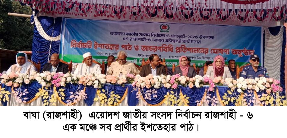 চারঘাট ও বাঘা প্রতিনিধি: ত্রয়োদশ জাতীয় সংসদ নির্বাচন ও গণভোট ২০২৬ উপলক্ষে রাজশাহী-৬ (চারঘাট-বাঘা) আসনের সব প্রার্থী এক মঞ্চে নির্বাচনি ইশতেহার পাঠ করেছেন এবং নির্বাচন আচরণবিধি প্রতিপালনের অঙ্গীকার ব্যক্ত করেছেন। গতকাল মঙ্গলবার বেলা ৩ টায় বাঘা-চারঘাট উপজেলা প্রশাসনের আয়োজনে বাঘা উপজেলার পারসাওতা বিনোদপুর উচ্চ বিদ্যালয় মাঠে এক মঞ্চে সব প্রার্থীর উপস্থিতিতে নির্বাচনি ইশতেহার পাঠ ও আচরণবিধি প্রতিপালনের ঘোষণা শীর্ষক অনুষ্ঠানের আয়োজন করা হয়।
