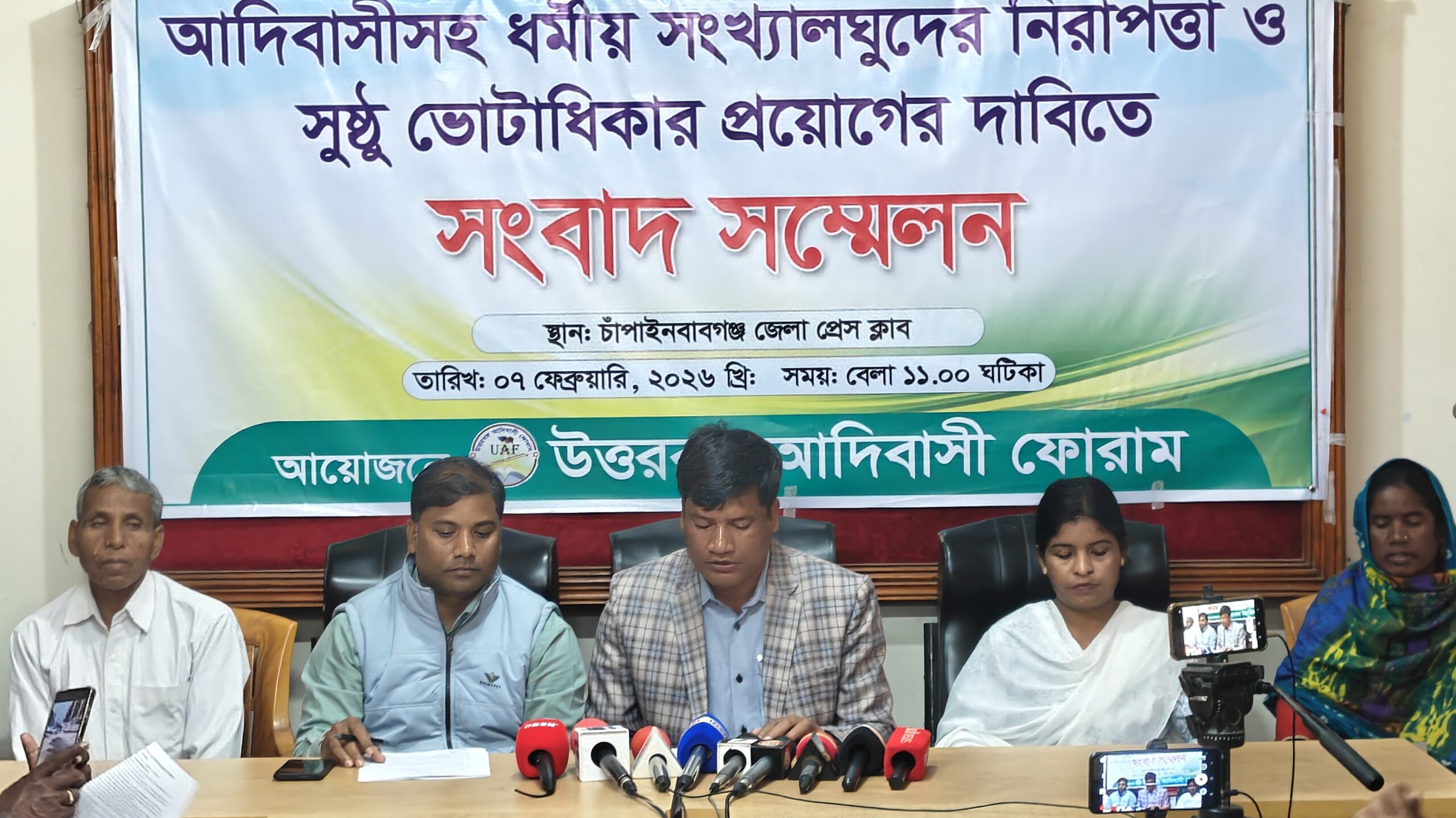 চাঁপাইনবাবগঞ্জ ব্যুরো: আদিবাসী ও ধর্মীয় সংখ্যালঘু জনগোষ্ঠীর নিরাপত্তা নিশ্চিত করা এবং আসন্ন নির্বাচনে তাদের সুষ্ঠু ভোটাধিকার প্রয়োগের দাবিতে চাঁপাইনবাবগঞ্জে সংবাদ সম্মেলন অনুষ্ঠিত হয়েছে।