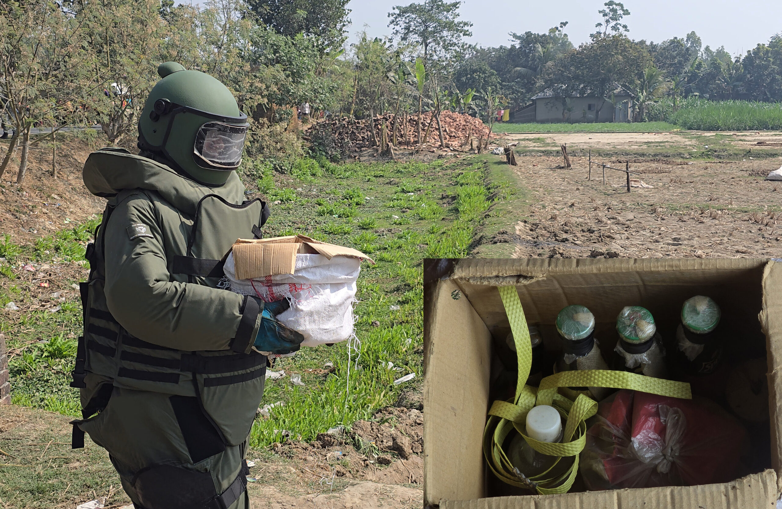 সেনাবাহিনীর বোম ডিসপোজাল ইউনিট এসে পেট্রোল বোমা, ককটেলল ও বোমা তৈরির সরঞ্জামদিগুলো ধ্বংস করেছে। ঘটনার পর এলাকায় অতিরিক্ত পুলিশ মোতায়েন করা হয়েছে এবং গুরুত্বপূর্ণ স্থানে নজরদারি বাড়ানো হয়েছে। পুলিশ জানিয়েছে, পরিস্থিতি বর্তমানে স্বাভাবিক এবং জননিরাপত্তা নিশ্চিত করতে টহল জোরদার করা হয়েছে।