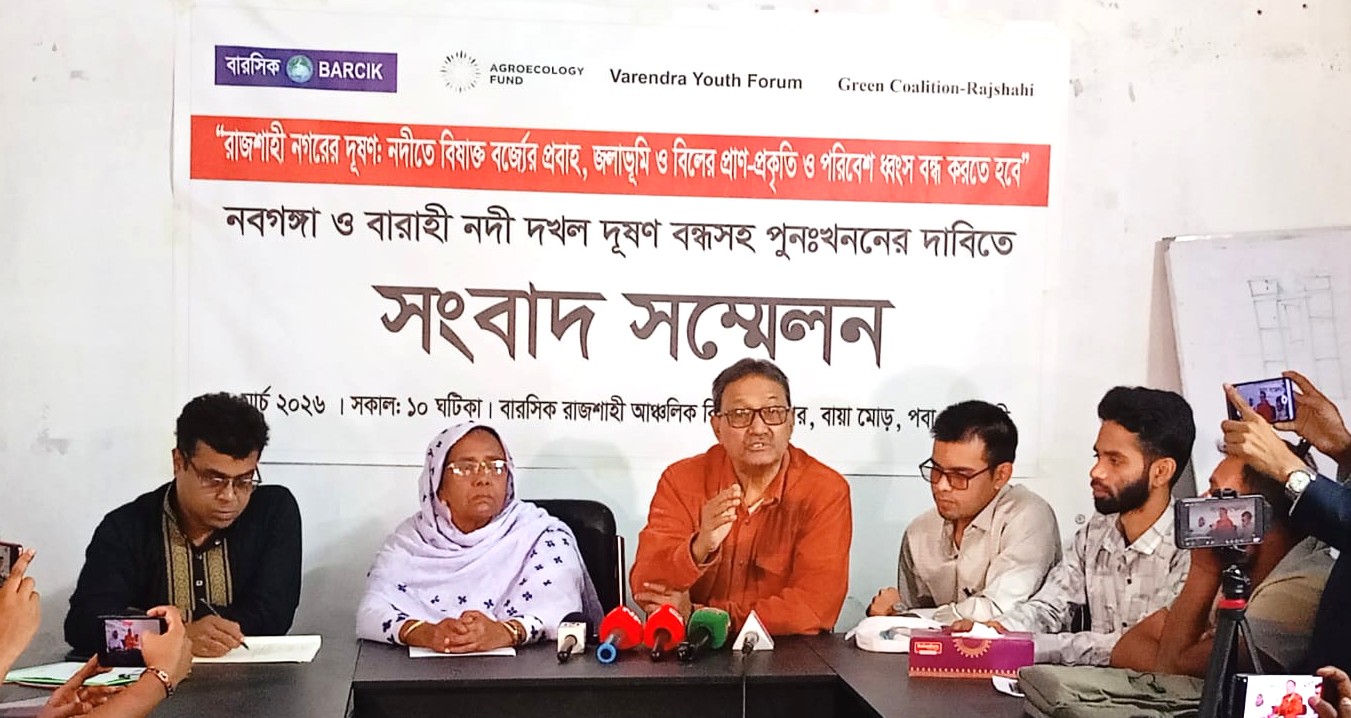স্টাফ রিপোর্টার: রাজশাহীর পদ্মা থেকে উৎসারিত নবগঙ্গা ও বারাহী নদীর দখল-দূষণ বন্ধ এবং পুনঃখননের দাবিতে সংবাদ সম্মেলন অনুষ্ঠিত হয়েছে।
