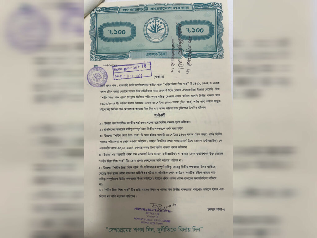 পরবর্তীতে আরেকজন বিশিষ্ট ব্যবসায়ীকে সঙ্গে নিয়ে পলাতক আসামি আনোয়ার হোসেনের পূর্ণ সম্মতিতেই প্রচলিত রীতি অনুযায়ী ৩০০ টাকার স্ট্যাম্পে মূল ইজারাদারের কাছ থেকে দায়িত্ব বুঝে নিয়েছি। ব্যবস্থায়ী অঙ্গনে চুক্তি হস্তান্তরের এই প্রক্রিয়া প্রাচীন এবং বৈধ হিসেবেই গৃহীত হয়ে আসছে। এই প্রক্রিয়ার সকল বৈধ কাগজপত্র আমার কাছে সংরক্ষিত রয়েছে। চুক্তি মোতাবেক আমাদের পক্ষ থেকে ‘মেসার্স উম্মে রোমান এন্টারপ্রাইজ’কে নগদ ৫৫ লাখ টাকাও পরিশোধ করা হয়েছে। শুধু তাই নয়, পার্কটির রাইডগুলো সব নষ্ট ছিল। দায়িত্ব পাওয়ার পরে আমি প্রায় ৫৫ লাখ টাকা খরচ করে রাইডগুলো সংস্কার করেছি। সবই শিশুদের একটা পরিবেশ দেয়ার স্বার্থে করা হয়েছে। এখান থেকে এখন পর্যন্ত আমাদের একটা টাকাও মুনাফা হয়নি।