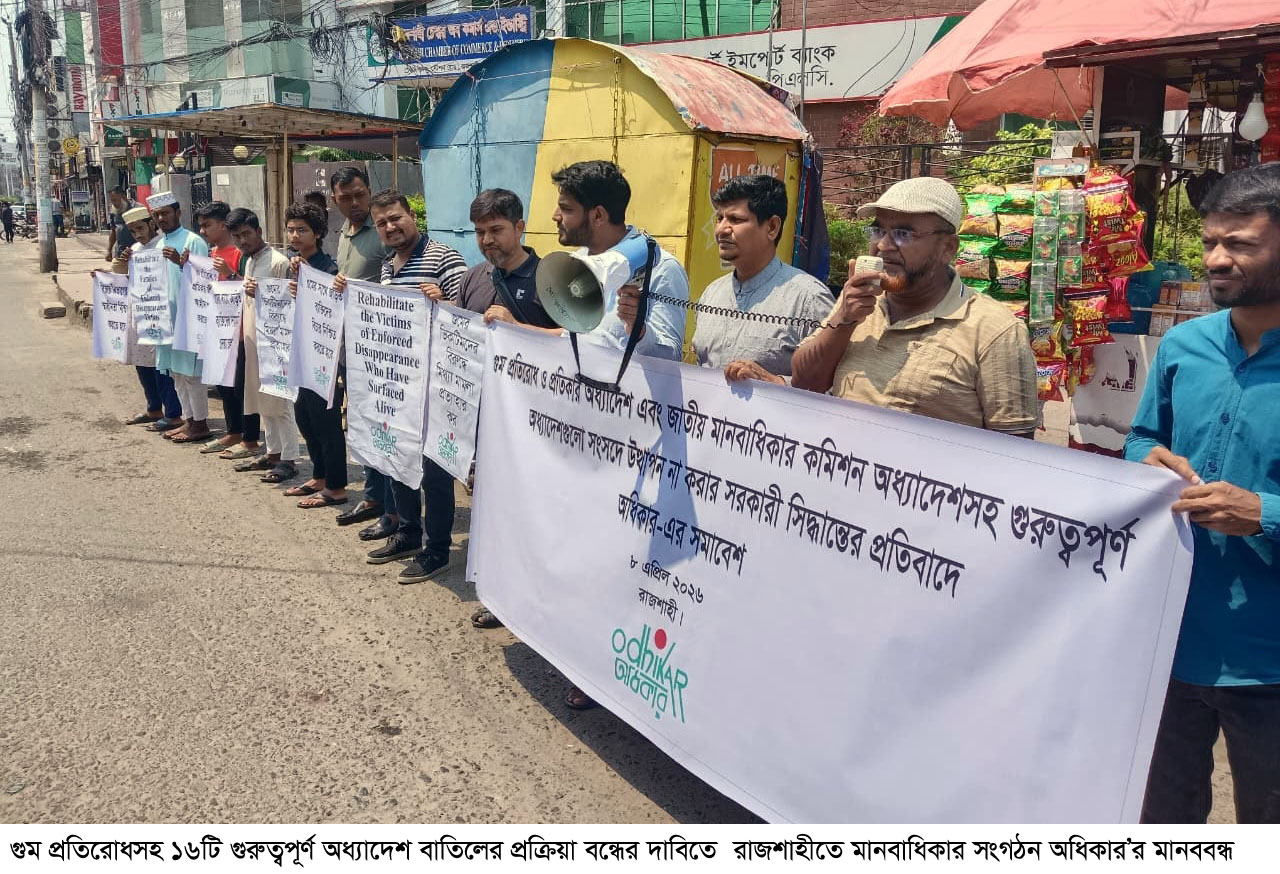 মানববন্ধন সঞ্চালনা করেন অধিকার’র রাজশাহী সমন্বয়ক সাংবাদিক মঈন উদ্দিন। উপস্থিত ছিলেন বাংলাদেশ ফেডারেল সাংবাদিক ইউনিয়নের সহকারী মহাসচিব ড. সাদিকুল ইসলাম স্বপন, রাজশাহী সাংবাদিক ইউনিয়নের সাধারণ সম্পাদক ডালিম হোসেন শান্ত, ফটো জার্নালিস্ট অ্যাসোসিয়েশনের সাবেক সভাপতি ও মানবাধিকার কর্মী আসাদুজ্জামান আসাদ, রাজনৈতিক বিশ্লেষক আনোয়ার হোসেন ফিরোজ, সামাজিক ও পরিবেশ কর্মী আহসান হাবিব, সাংবাদিক এম শামিম, সাংবাদিক হুজাইফাসহ রাজশাহী জেলা ও নগরীর অধিকার কর্মীরা। এসময় অধিকার’র বিবৃতি পাঠ করেন, গুম থেকে ফিরে আসা ভুক্তভোগী আল আমিন হোসেন। বক্তারা অবিলম্বে গুরুত্বপূর্ণ অধ্যাদেশগুলো জাতীয় সংসদে পাস করার জন্য প্রধানমন্ত্রী তারেক রহমানের প্রতি জোরালো আহ্বান জানান। তাদের মতে, মানবাধিকার ও সুশাসন নিশ্চিত না হলে দেশের টেকসই উন্নয়ন সম্ভব নয়।