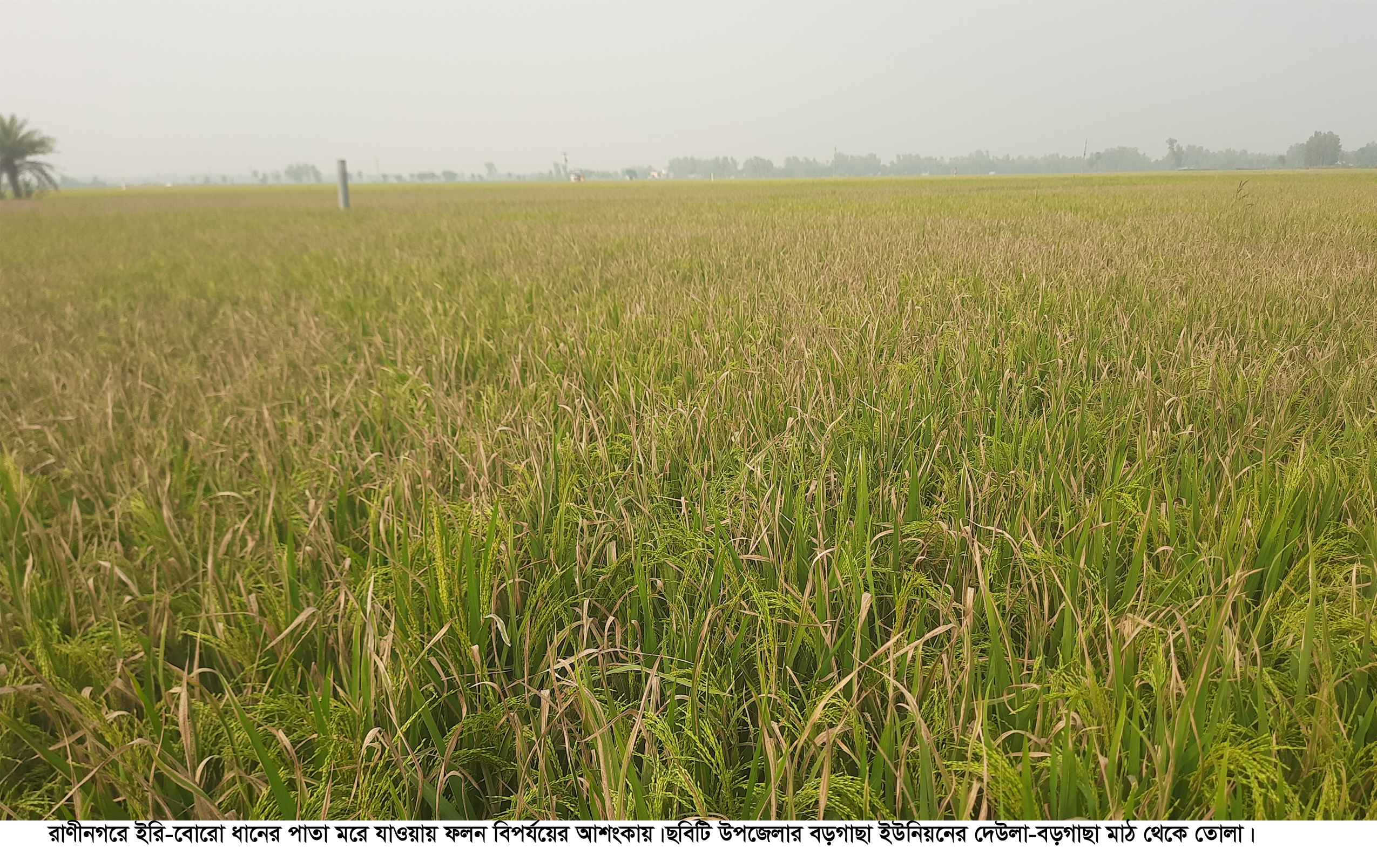 উপজেলার বড়গাছা গ্রামের কৃষক জফির উদ্দিনের ছেলে শাহীন জানান, দেউলা তিমোহনী মোড়ে আমরা কয় ভাই মিলে প্রায় ১২ বিঘা জমিতে জিরা জাতের ধান চাষ করেছি। ইতি মধ্যে ধানের শীষের মাথা গড়তে শুরু করেছে। হঠাৎ করে ধানের পাতাগুলো মরে যাচ্ছে। রোগবালাই মুক্ত রাখতে বিভিন্ন কোম্পানীর কীটনাশক প্রয়োগ করেও কোন লাভ হচ্ছে না। কৃষি অফিসের লোকজনদের তেমন সহযোগীতা আমরা পাই না। ধানগুলো দিন দিন খারাপের দিকে যাচ্ছে। আশানুরুপ ফলন নিয়ে হতাশায় আছি।
