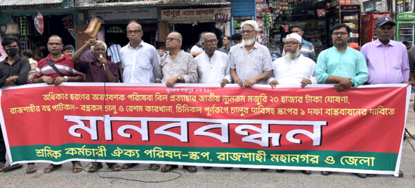 স্টাফ রিপোর্টার: অত্যাবশ্যক পরিসেবা বিল প্রত্যাহার, জাতীয় ন্যুনতম ২০ হাজার টাকা মজুরি ঘোষণা, রাজশাহীর বন্ধ পাটকল, বস্ত্রকল, রেশম কারখানা ও চিনিকল পূর্ণভাবে চালুসহ ৯ দফা…