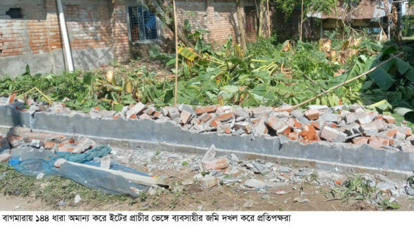 বাগমারায় ইটের প্রাচীর ভেঙে জমি দখলের অভিযোগ